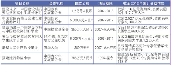 2012年,建行实施了10个重要公益项目,捐赠总额2,300万元。(见表)